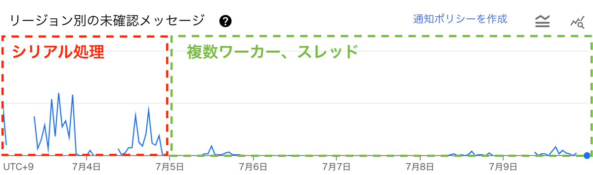 同様に、Subscription における未確認(Ack されていない)メッセージ数の変化を検証しました。7月5日に新機能を適用した後、未確認メッセージ数が劇的に減少しました。グラフの縦軸は未確認メッセージ数を示しています。